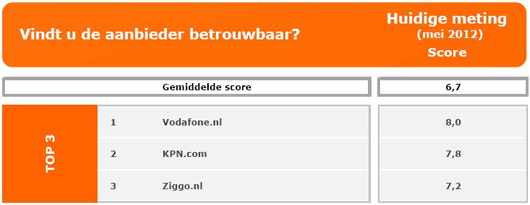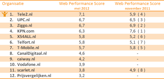 Zoals al onder de ranglijst staat aangegeven, was de website van KPN tijdens een van de onderzoekssessies beperkt bereikbaar. De invloed hiervan moet echter als minimaal beschouwd worden. 65% van de respondenten heeft de website van KPN bezocht tijdens dit onderzoek, wat slechts een beperkte daling betekent ten opzichte van de 72,5% in november 2011.De voorkeur voor KPN daalt van 22,5% naar 10%. De versterkte positie van Tele2 is hier mogelijk de oorzaak van. De website van KPN scoort nog wel goed op de door ons onderzochte thema’s, waarbij ook hier opvalt dat de keuze voor KPN meer met betrouwbaarheid dan met de prijs te maken heeft. “Super degelijk, maar wel duur”, onderstreept een respondent dit punt.