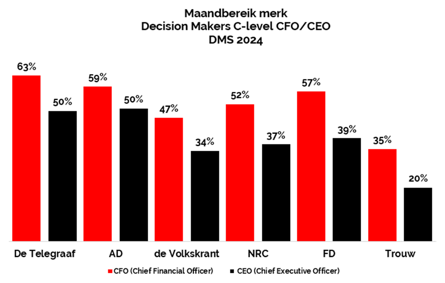 Met een bereik van 45% onder alle zakelijke beslissers in Nederland, voert De Telegraaf de lijst aan bij directieleden (45%) en C-level executives zoals CFO's (63%) en CEO's (50%).