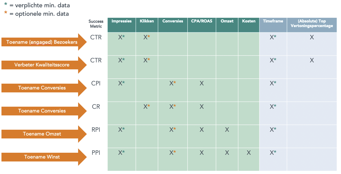 Om antwoord te krijgen welke variant de beste bijdrage levert aan één van bovenstaande doelen, is het belangrijk om de test op de juiste success metric te beoordelen.