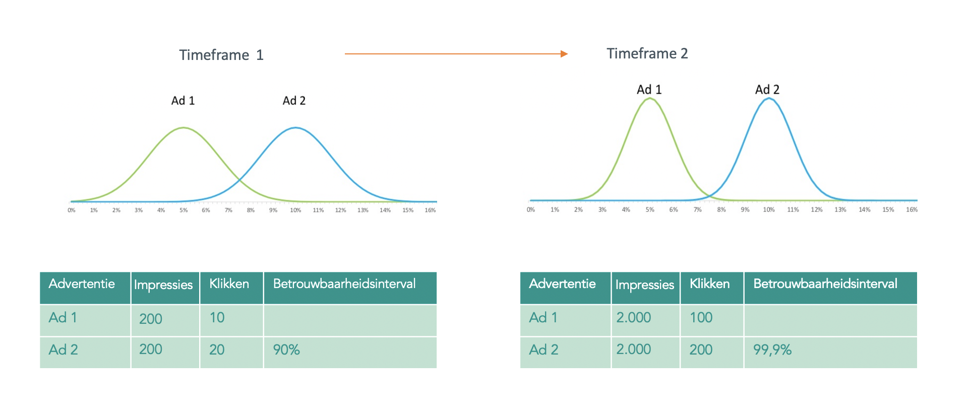 Voordat we dieper ingaan op de success metric, kijken we naar de voorwaarden die nodig zijn om je data zo betrouwbaar mogelijk te beoordelen. We willen uitsluiten dat het resultaat op toeval berust. Dit kunnen we toetsen middels statistische significantie en het bijbehorende betrouwbaarheidsinterval. Hoe hoger het betrouwbaarheidsinterval hoe groter de zekerheid dat het resultaat niet op toeval berust, maar zich vaker zal herhalen. Twee factoren die hieraan bijdragen zijn: