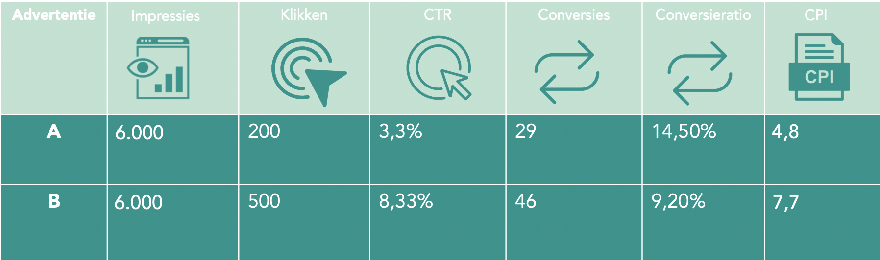 • CTR: klikken gegenereerd door de advertentietekst