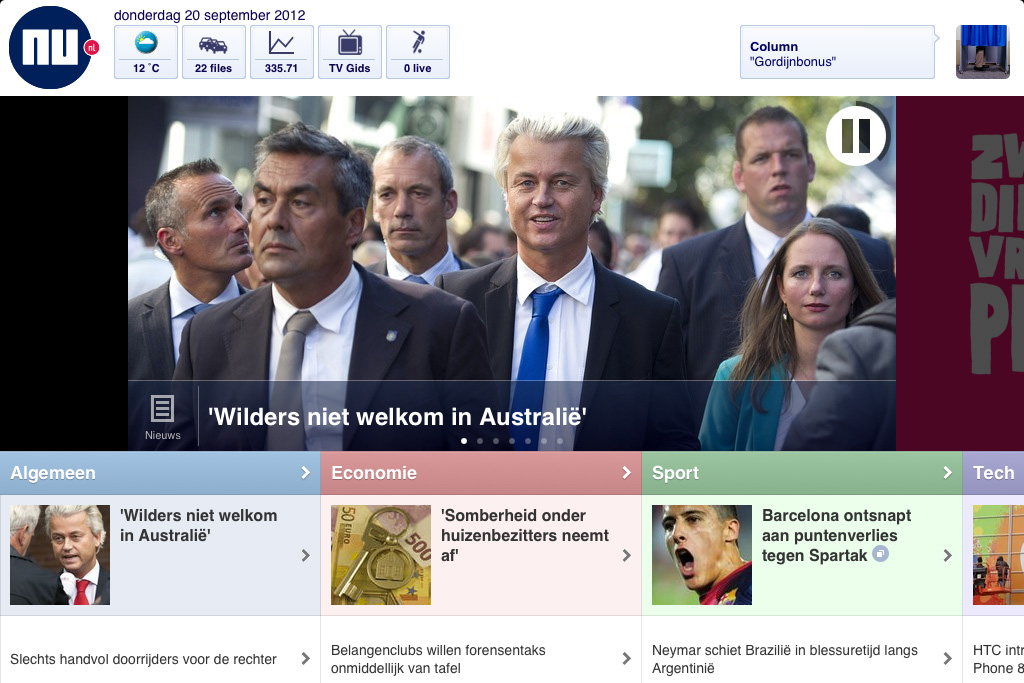 Roderick Martens veert op. “Klopt. Ons succes begon met de RSS-feed. Die bood mensen de mogelijkheid om de wijzigingen op verschillende websites online en realtime te laten doorlopen op de eigen pc. Zo kregen ze dan hun eigen nieuwsdienst. Wij lopen steeds voorop: zo hadden we de NU.nl-app voor de iPad al klaar toen de iPad nog niet eens verkocht werd in Nederland. Ook op dit moment gaat er een substantiële investering naar technologie: we werken bijvoorbeeld aan een universal build voor iPhone en iPad. Ook investeren we in een Facebook Reader en lanceerden we recent een nieuw platform genaamd NuPubliek dat inzicht geeft in gedrag en stemmingen binnen partijen en personen in de politiek.