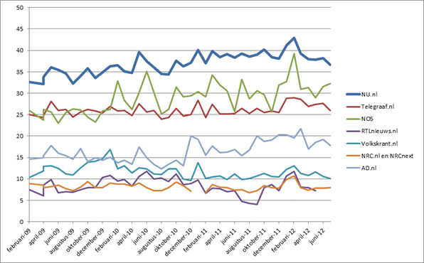 Nieuws. Vrolijk word je er meestal niet van, van oorlog, geweld, crisis en verdriet. Maar we kunnen het niet laten: nog voor de koffie willen we op de hoogte zijn, voorop lopen en bijblijven. Tien jaar geleden lazen we de krant. Tegenwoordig klikken we op de tablet en smartphone meteen naar NU.nl. Deze nieuwssite bereikt in 2012 meer dan 5 miljoen unieke bezoekers per maand. Bezoekers komen zowel via de website als via de mobiele site en apps. Het mobiele gebruik groeit hard: in het laatste halfjaar komen er veel meer bezoekers via mobiel dan via de traditionele site!