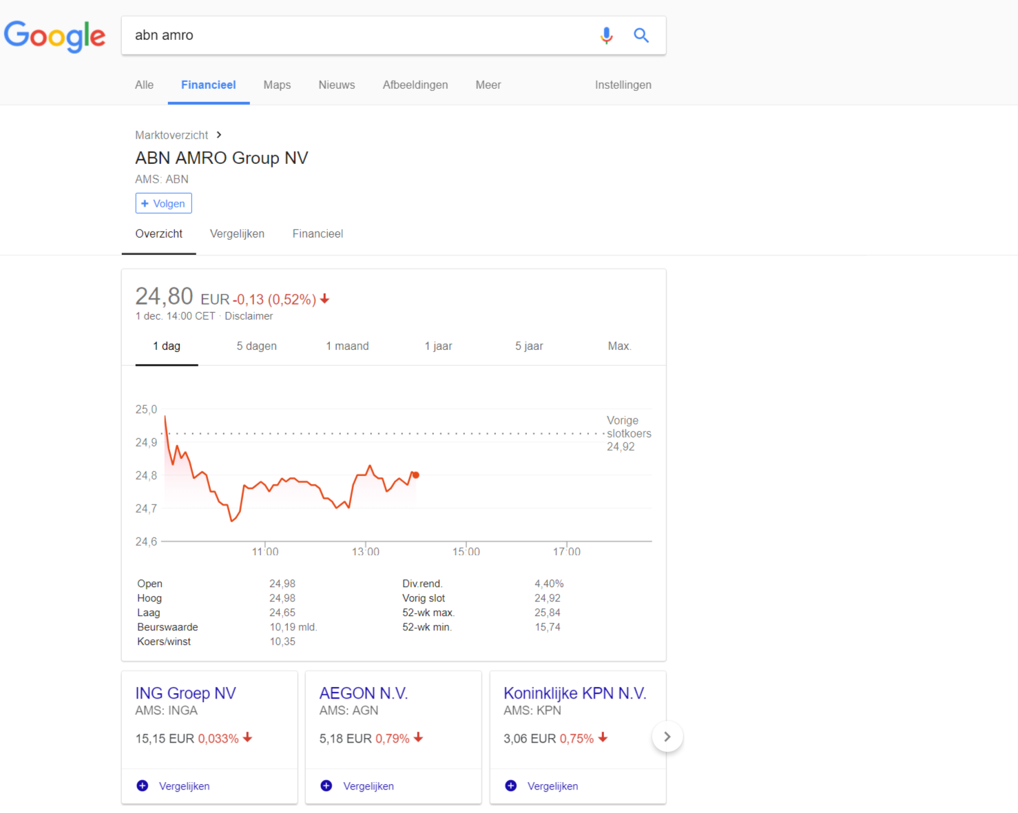 Zowel op desktop als op mobiel vind je onder Meer >> nu een tab voor Financieel. De laatste marktinzichten, nieuws, beurskoersen en weet ik wat niet al. Je kan voorkeuren toevoegen aan je Google profiel, zodat je daar meteen de informatie kunt vinden van bedrijven die je wilt volgen. Dus voortaan als je zoekt op een bedrijf of bepaalde koersen kun je daar terecht voor alle info.