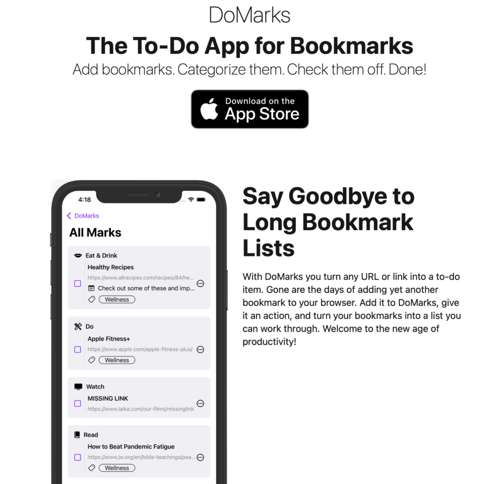 DoMarks is een heerlijke oplossing als je worstelt met het verzamelen van steeds meer bladwijzers. Want je kunt ze natuurlijk wel opslaan maar dan moet je er ook wel eens een keer iets mee doen. DoMarks is een speciale taak-app voor al je bladwijzers. Wanneer je een website, artikel, video of link als bladwijzer wilt opslaan, bewaar die dan in DoMarks en de bladwijzer zal in een to-do-item veranderen. Daarnaast kan je er direct een vervolgactie aan toevoegen. Als je bijvoorbeeld een artikel opslaat, kun je een actie toevoegen waarin staat in welke context je dat artikel hebt gevonden, of waarom je het wilt lezen. Voor verzamelaars zoals ik een superontdekking. Voorlopig wel alleen beschikbaar voor de Apple platformen.