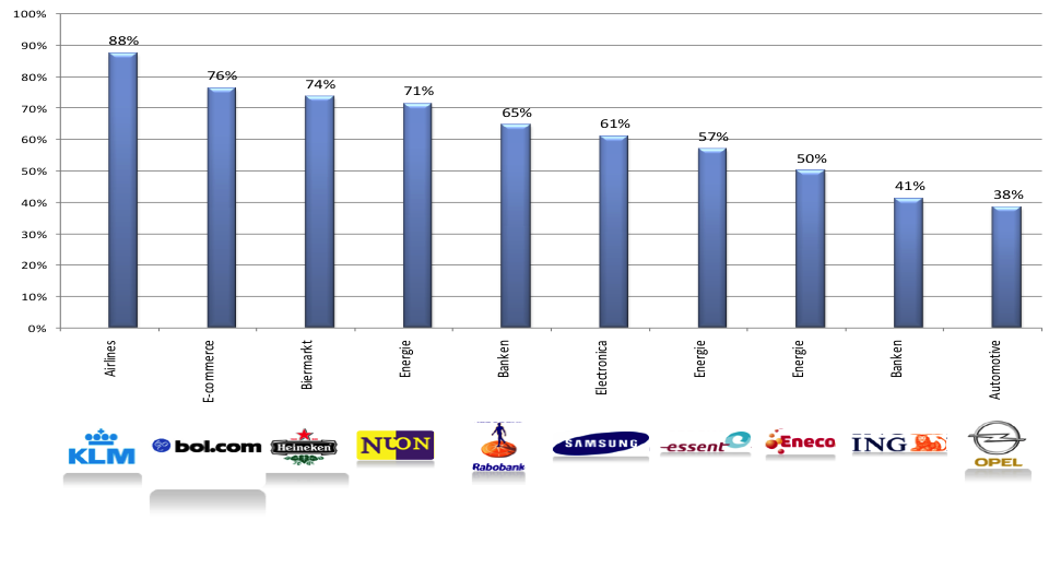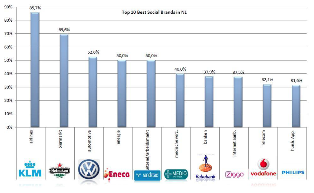 In het onderzoek, waarvan de resultaten tijdens het MIE 2013 worden gepresenteerd, konden respondenten voor 19 branches zelf aangeven, welke merken zij het beste vinden in social media. De top 3 bestaat deze editie dus uit KLM, Bol.com en Heineken. KLM stond al op nummer 1, Bol.com is de nieuwkomer die van buiten de top 10 ineens op 2 staat. Hoewel Heineken qua voorkeurspercentage is gestegen, staat het merk nu op plaats 3.