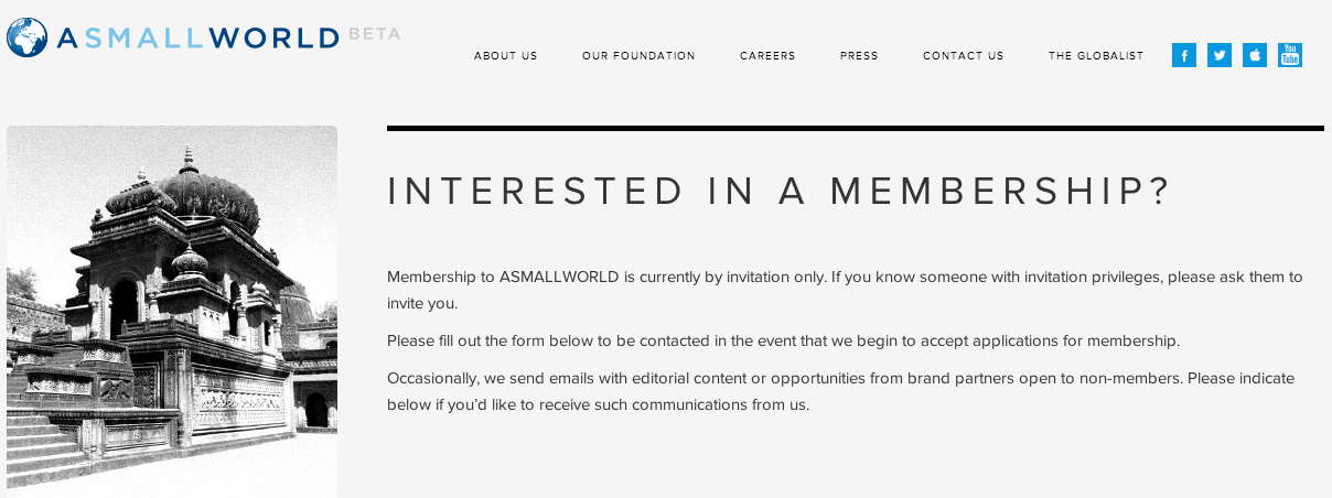 Ik kende het niet, asmallworld.com, maar blijkbaar is het by invitation only (en wie wil Edwin Vlems nou als lid?) Maar wat me direct opvalt: ze willen helemaal niet exclusief zijn, ze willen hun exclusieve imago gebruiken om uiteindelijk veel geld te verdienen. Want als je de inschrijfpagina goed bekijkt, wordt vrij snel na de ‘invitation only‘ vermeld dat men wel op een wachtlijst mag ‘mocht men opeens iedereen als lid willen accepteren’.