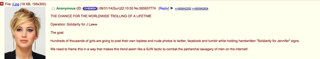 - Warren, Rossaly, “4chan Tried To Get Women To Share Nude Photos In Solidarity With Jennifer Lawrence”, Buzzfeed, September 1, 2014