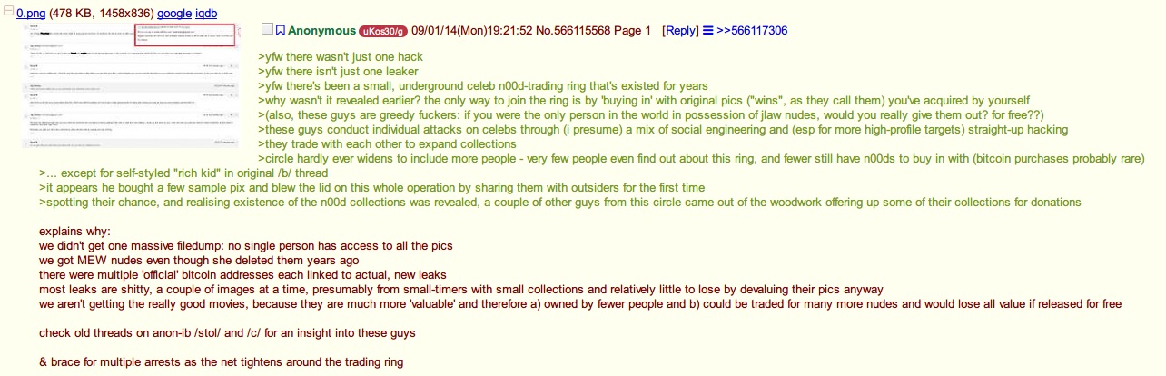 - Sargent, Jordan, “Is This 4chan Offshoot the Ground Zero for the Leaked Celebrity Nudes?”, Gawker, September 1, 2014