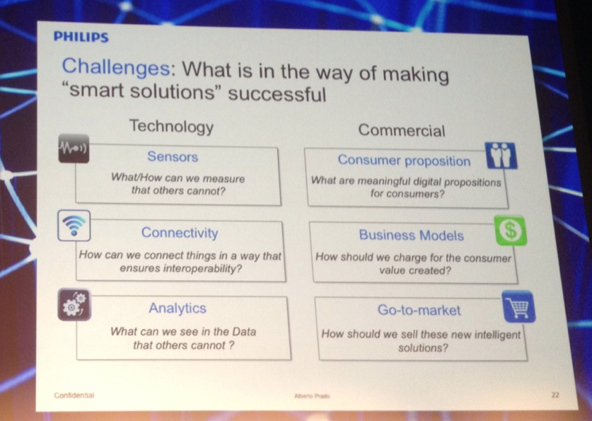 Een laatste mooie take-away kwam van bovenstaande toekomstige slide. De smartphone is niet een product, maar een service delivery channel. Philips gaat dus van verkoper van producten, diensten verkopen met haar producten. Daarmee gaan ze kwalitatief weer betere producten maken die langer meegaan omdat ze langer hun service over het ene product willen uitsmeren.
