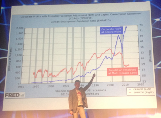 Met beide benen op de grond komt Pistono ten tonele en staat iedereen vrolijk toe te blaffen dat over 20 jaar niemand meer een baan heeft. Dit staat enigszins in contrast tot het vorige verhaal, maar is wel weer volledig in lijn met de consensus van de dag. Hij komt met cijfers over employement vs profitability.
