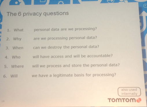 TomTom’s chief privacy officer (CPO) had een verhaal over het verzamelen van data en wat je wel en niet moet doen. Dit verhaal is gebaseerd op de ervaring van TomTom toen zij in de ogen van het publiek hun data ‘verkochten’ aan de politie. Er was toen trouwens meer sociale onrust over TomToms data sale dan nu over PRISM. De data van TomTom was tenminste nog geanonimiseerd, en dat doet PRISM zeker niet.