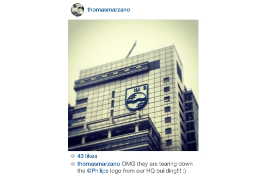 Hoe merk en mens elkaar versterken, ervaarde Thomas zelf weer eens in november. Hij kijkt er nog steeds met verbazing op terug. In de week voor de lancering van de nieuwe merkidentiteit bracht hij met één foto op Instagram een lawine van media-aandacht op gang. De geheimzinnige ontmanteling van het oude Philips-logo op het Amsterdamse hoofdkantoor deed alle journalisten naar de telefoon grijpen. Binnen één dag werd het verhaal opgepikt door de grootste media van Nederland. De Instagram-actie van Thomas was onderdeel van een goed geplande strategie. “We waren benieuwd wat er zou gebeuren. Dat er zó veel aandacht zou komen, hadden we niet verwacht.”