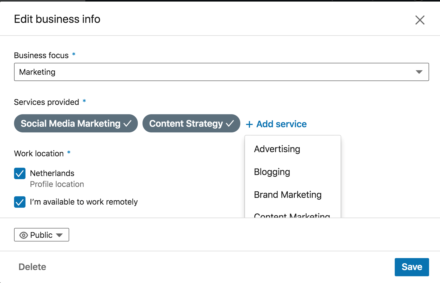 Helaas moet je kiezen uit bepaalde diensten en ik kan me voorstellen dat jouw exacte dienst er niet bijstaat. Ik kan bijvoorbeeld geen ‘LinkedIn Trainer’ of ‘Employer Branding’ kiezen, maar alleen ‘Social Media Marketing’ en dat is natuurlijk heel breed.