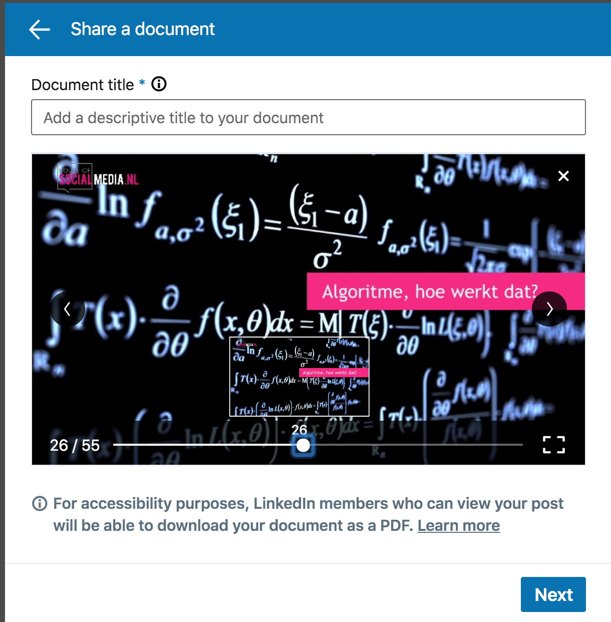 Met de functie LinkedIn documenten kun je nu bijvoorbeeld een pdf, PowerPoint-presentatie of een ander document toevoegen bij je statusupdates. Klik op het pictogram ‘document’ bij je statusupdate en vanuit hier kun je het document eenvoudig uploaden. Voeg een titel toe en deel je document via een statusupdate. De laatste maanden zie ik dat veel bedrijven gebruiken maken van deze optie voor het delen van vacatures. Een mooie ontwikkeling! Let er wel op dat wanneer je een PDF deelt met alleen tekst, dat dit slecht leesbaar is voor mobiele gebruikers.