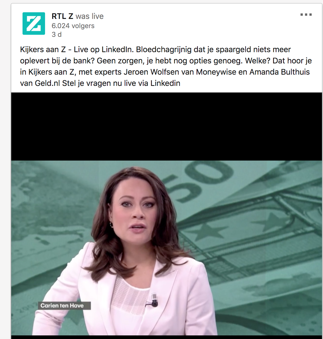 Heb jij de livestreams al voorbij zien komen op LinkedIn? Met een live video kun je direct de interactie aangaan met de kijkers. Een leuk voorbeeld van LinkedIn live is de wekelijkse livestream van RTL Z, ‘Kijkers aan Z’, elke vrijdag om 12.00 uur. Je kunt de uitzending live bekijken en direct vragen stellen in de comments onder de video.