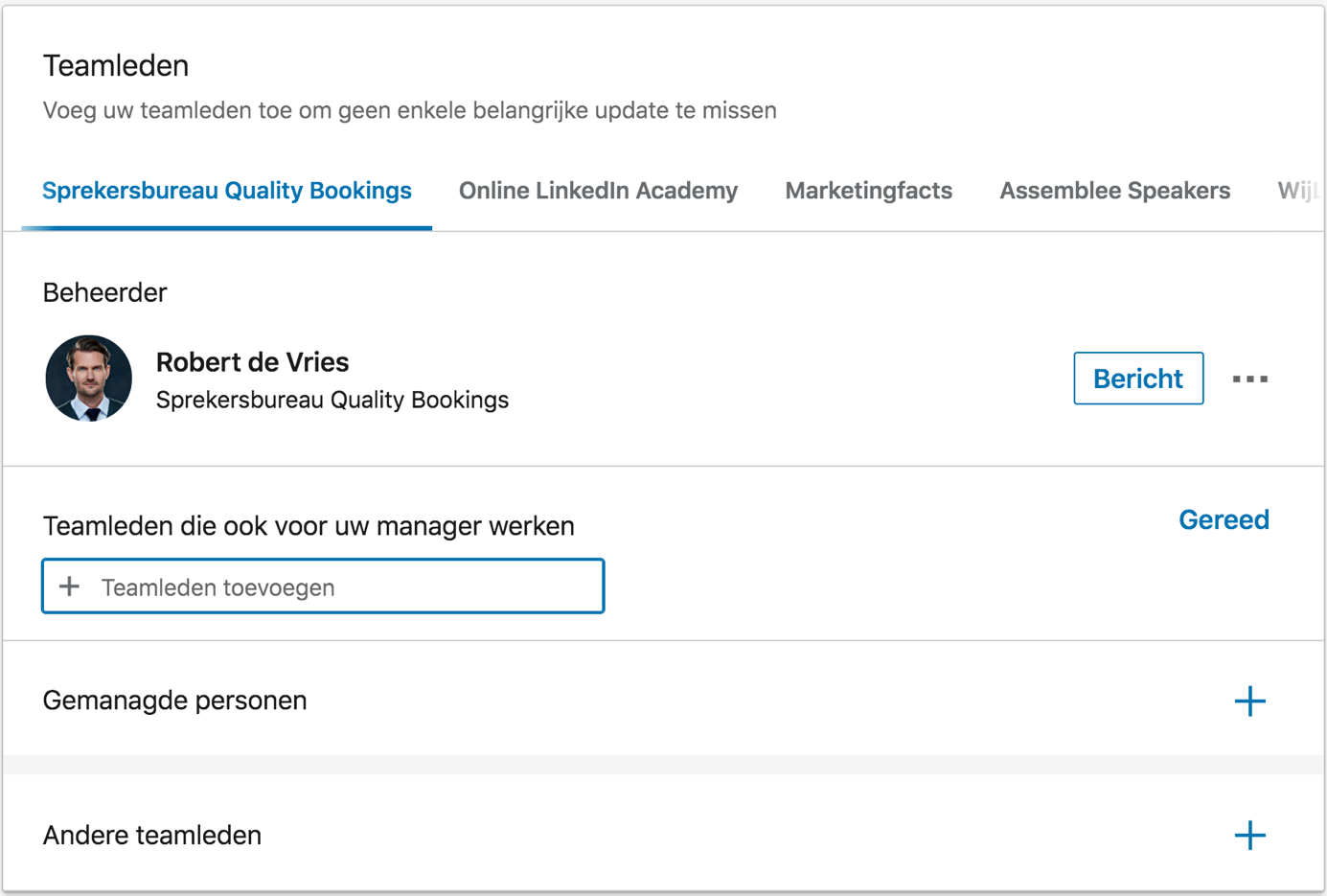 Hoi Ellen, dat hoeft niet. Zie je de optie “Teamleden” niet staan bij “mijn netwerk?”. Switchen naar Engels kan nog wel eens helpen inderdaad!