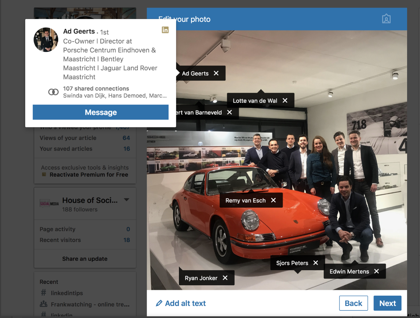 Naast het taggen van personen in updates kun je sinds een paar maanden ook personen taggen in foto’s. Uiteraard kan dit alleen als de LinkedIn-gebruiker dit zo heeft ingesteld bij privacysettings. Het voordeel: de getagde personen krijgen een notificatie. Let er goed op waar je de tag plaatst op een foto, want je kunt dit later niet meer aanpassen. Tag alleen mensen die daadwerkelijk op foto staan, geen mensen die niets met de post te maken hebben. Deze functie is ook beschikbaar voor de bedrijfspagina’s.