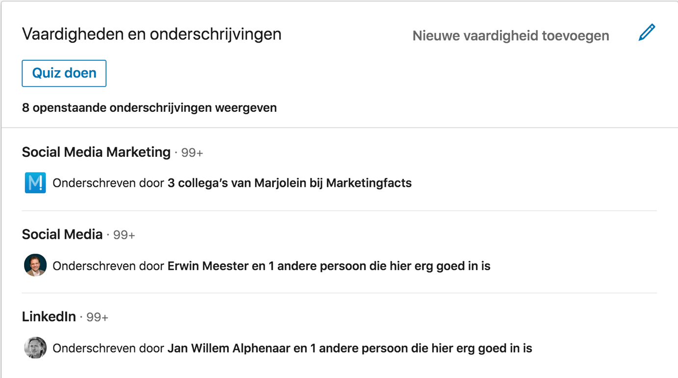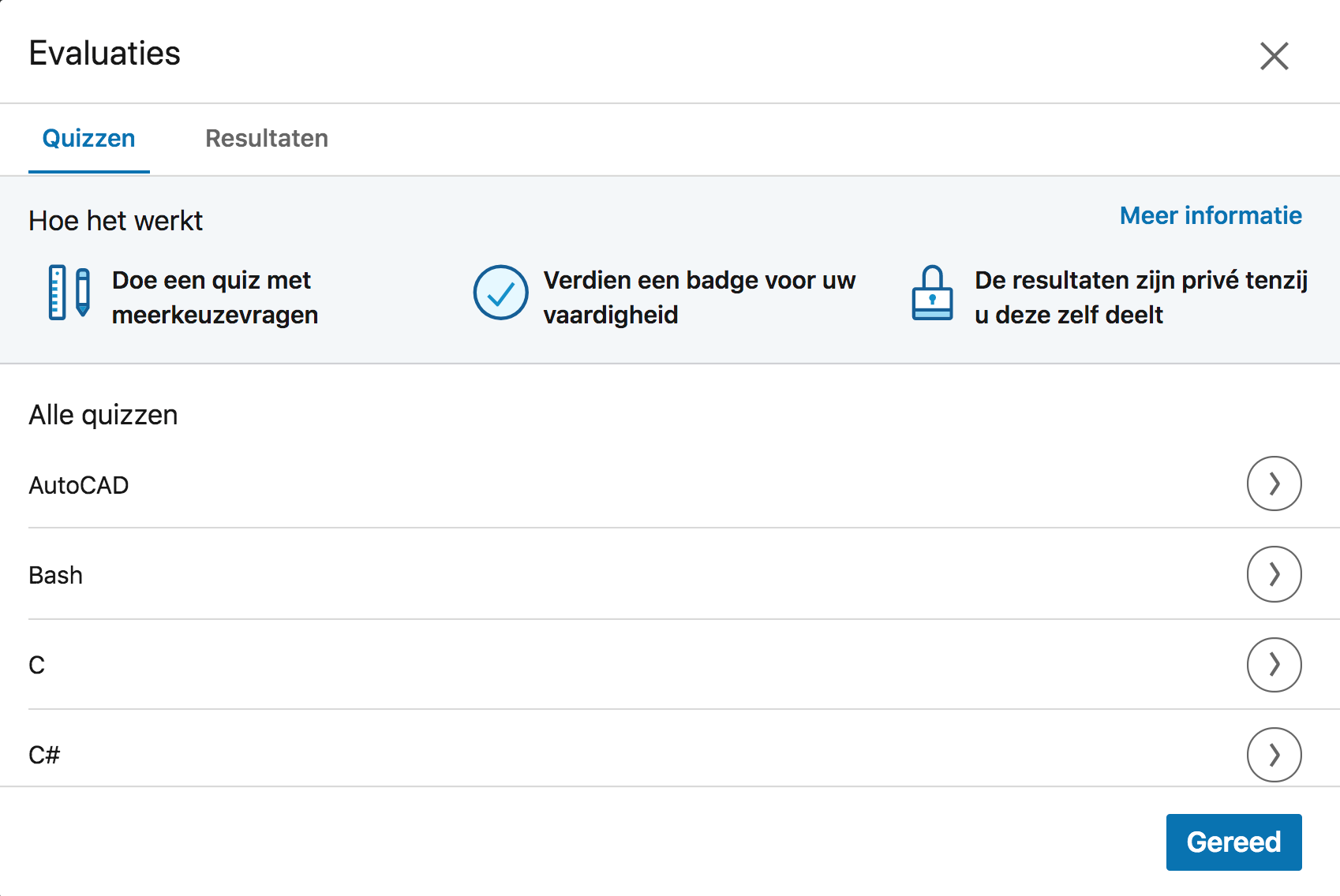 Op je LinkedIn-profiel zie je bij het onderdeel ‘Vaardigheden’ de optie ‘Quiz doen’. Wellicht is deze functie nog in de testfase, want de vaardigheden matchen vaak totaal niet met de profielen. Je zou hiermee badges kunnen winnen die mogelijk later worden weergegeven op je profiel.