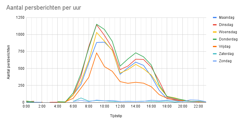 Dinsdag en donderdag zijn de populairste dagen om een persbericht te sturen. De meeste persberichten worden op doordeweekse dagen verstuurd tussen 9.00 en 11.00 uur. Richting de lunch halveert het volume, maar er is weer een opleving tussen 13.00 en 15.00. Op vrijdagmiddag, zaterdag en zondag is het voor de meesten al weekend: er wordt dan amper meer iets verstuurd.