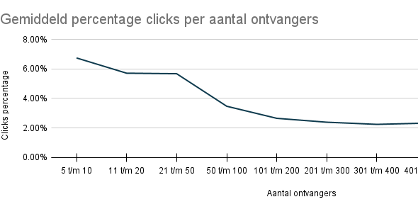 Het aantal ontvangers heeft een flinke invloed op het aantal fails (niet-aangekomen berichten). Waar bij de persberichten t/m twintig ontvangers doorgaans geen fails voorkomen, ligt bij een verzendlijst met meer dan 200 adressen het gemiddelde aantal fails boven de tien. Hiermee begeef je je als verzender op glad ijs, want een hoog aantal fails kan op termijn een domeinreputatie schaden.