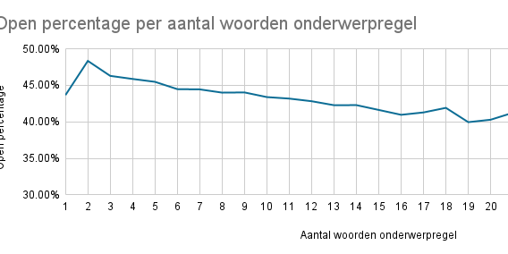 Wat heeft er dan wel invloed op de open rate? De lengte van de onderwerpregel. Boven de tien woorden zakt de open rate onder het gemiddelde. Die daling zet door naarmate de onderwerpregel langer wordt. Houd het onderwerp dus zo to the point mogelijk.