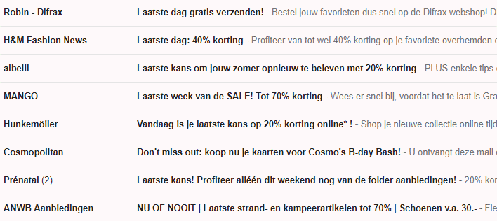 - Persuasion-technieken kunnen heel goed werken, mits je ze goed toepast. Het voorbeeld hieronder toont een verzameling van onderwerpregels waarin de ‘fear-of-missing-out‘ wordt toegepast. Doordat veel partijen dit doen, valt je mail duidelijk minder op: