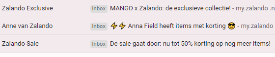 Probeer, voor de herkenbaarheid, niet te veel af te wisselen in de afzendernaam, dit heeft een negatieve invloed op je open-ratio. Je kunt natuurlijk wel testen met je afzendernaam. Denk bijvoorbeeld aan de tests van Zalando: ‘Anne van Zalando’ versus ‘Zalando’. Hieronder een mooi voorbeeld van de verschillende mails die Zalando stuurt en de afzendernamen die ze gebruiken. Je weet hierdoor duidelijk wat je kunt verwachten van de inhoud van de mail: