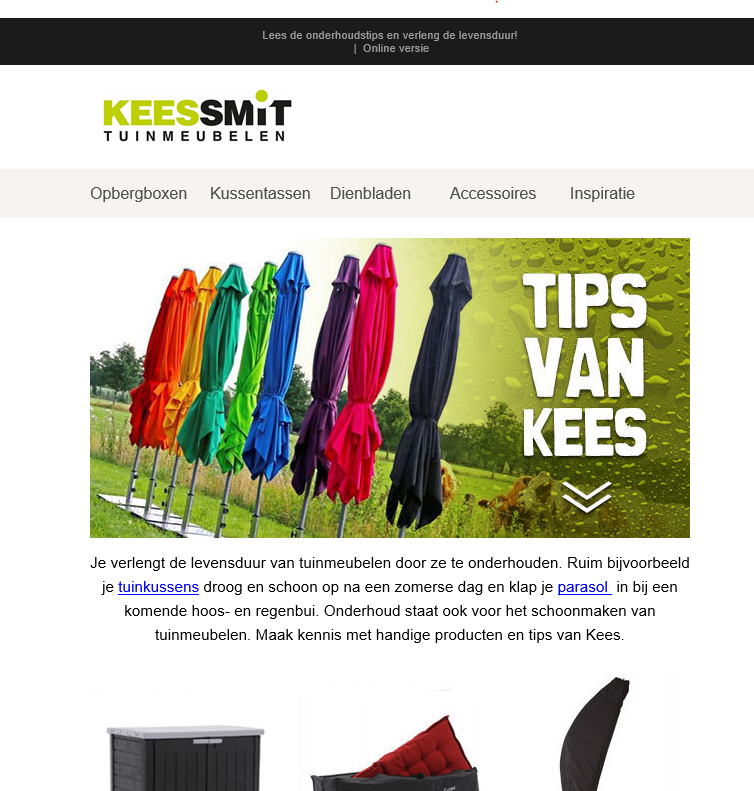De snippet is, na de onderwerpregel, de eerste tekst die je als preview ziet in je inbox. De tekst vind je meestal bovenin een nieuwsbrief. Ook in deze tekst kun je personalisatie toevoegen en dit kan net zo goed werken als personalisatie in de onderwerpregel. Benieuwd waar je deze tekst meestal kunt vinden? Zie het voorbeeld van Kees Smit. De snippet tekst bevindt zich in de zwarte balk en bevat de tekst: ‘Lees de onderhoudstips en verleng de levensduur’: