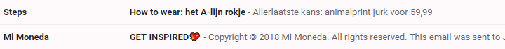 Wanneer de snippettekst niet gevuld is, wordt de eerstvolgende tekst uit de mail als preview gebruikt. Dit zijn vaak de webversie-link, de menu-items en soms zelfs de uitschrijflink. Onderstaand voorbeeld geeft mooi weer hoe de snippet je onderwerpregel kan versterken (voorbeeld Steps), maar ook wat er gebeurt als je de snippet niet gebruikt (voorbeeld Mi Moneda):