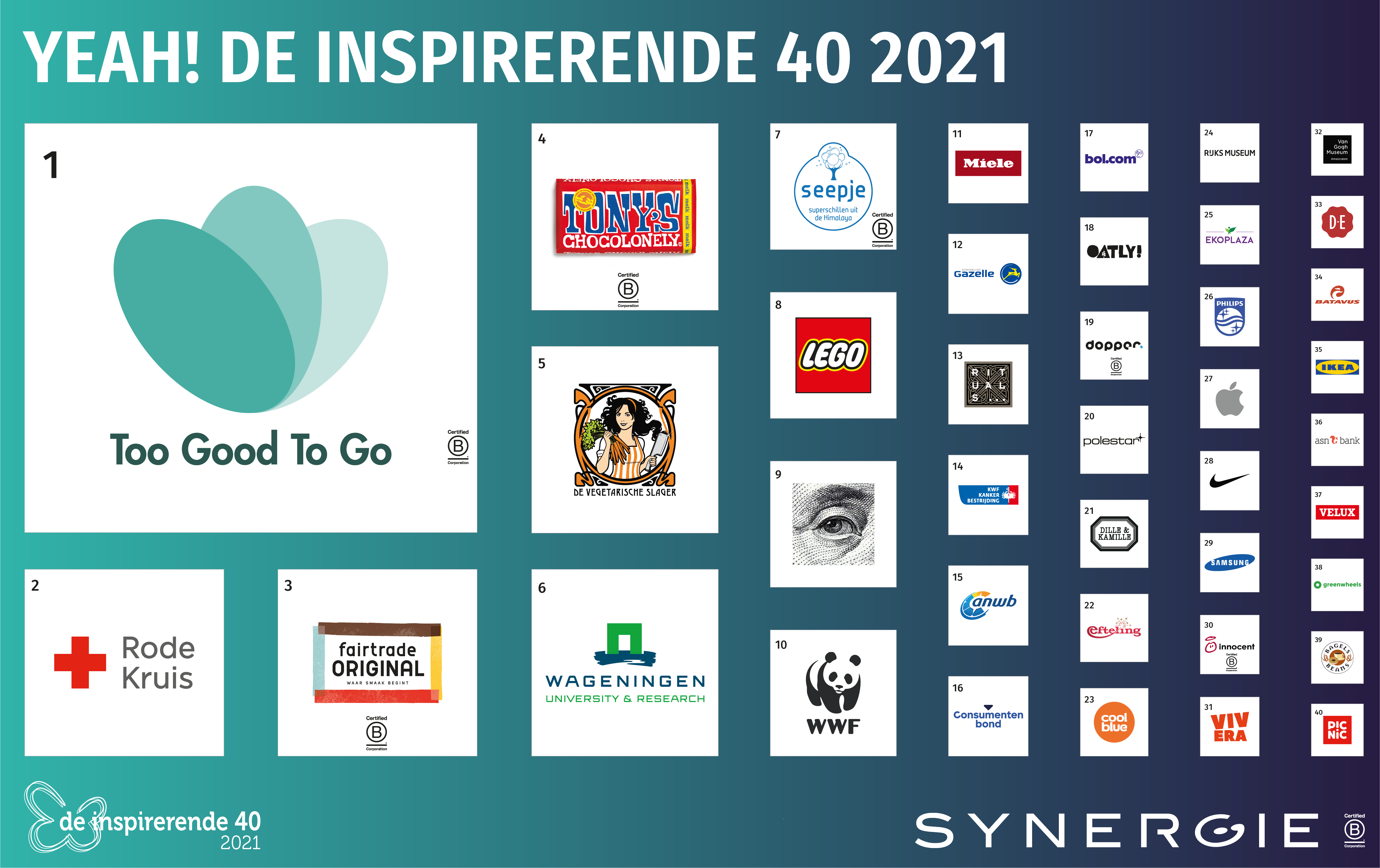Too Good To Go is volgens Nederlanders alweer de meest inspirerende organisatie. Het bedrijf staat in de 2021 editie voor de derde keer op nummer 1 in de Inspirerende 40 van Adviesbureau Synergie in samenwerking met Dynata en DataIM. Het Rode Kruis staat op 2, Fair Trade Original op 3, Tony Chocolonely op 4 en De Vegetarische Slager op 5.