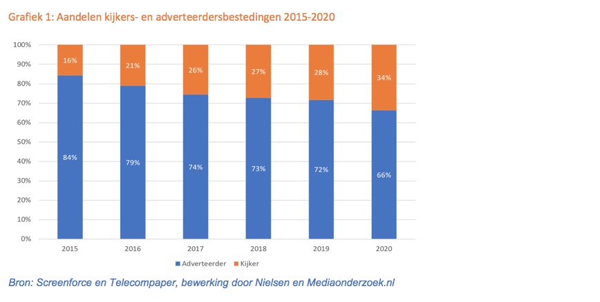 Tweederde van de bestedingen zijn in 2020 afkomstig van de adverteerder tegenover een derde van de kijker. Het aandeel van de kijkersinkomsten is in vijf jaar tijd verdubbeld van 16 procent in 2015 naar 34 procent in 2020.