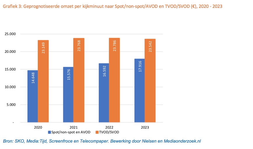 De kijkersomzet per minuut video ligt in 2020 met 23.000 euro veel hoger dan de inkomsten uit advertenties (14.648 euro). Voor de komende jaren is te verwachten dat de kijkersinkomsten per minuut redelijk blijven en dat de omzet uit advertenties in het lineaire/AVOD-deel iets zal toenemen tot zo’n 18.000 euro per minuut. Dat is nog altijd 30 procent lager dan de opbrengsten per minuut in het SVOD/TVOD-deel.