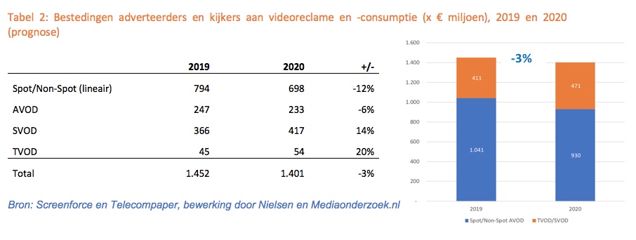 De bestedingen van de kijker en de adverteerder zijn net als de kijktijd te verdelen naar lineair/AVOD en TVOD/SVOD. Hiervoor zijn gegevens van Screenforce en Telecompaper gebruikt. Voor 2019 en 2020 (prognose) ziet dat er als volgt uit: