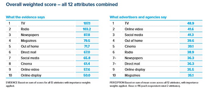 Televisie is het enige medium waarbij de perceptie van professionals overeenkomt met de onderzoeksresultaten. Voor alle andere media komen perceptie en waarheid niet overeen. Kranten, magazines en radio werken vele malen beter bij merkbouw op de lange termijn dan gedacht wordt, online video en social media zijn van veel mindere waarde.
