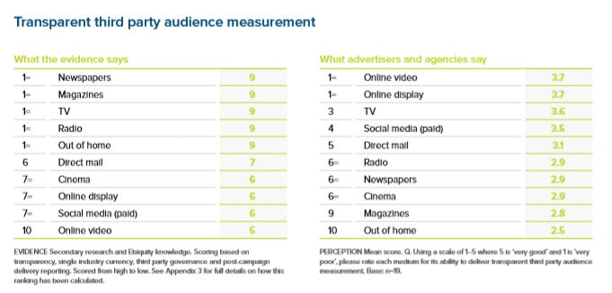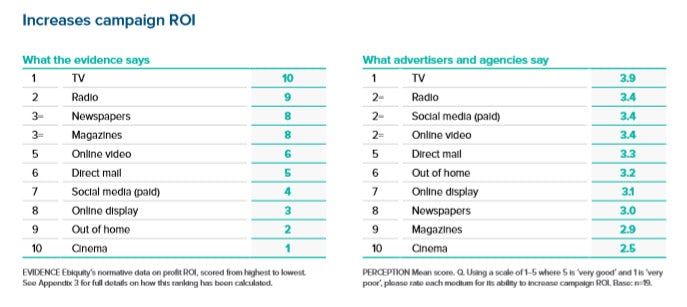Vooral radio lijkt ondergewaardeerd te worden: het staat op de zesde plaats in de score van adverteerders en bureaus, terwijl het op de tweede plaats staat wat betreft werkelijke resultaten. Zo ook printmedia: kranten en magazines komen direct na tv en radio, en zijn daarmee alsnog beter in merkbouw dan online media (in tegenstelling tot wat adverteerders en bureaus denken).