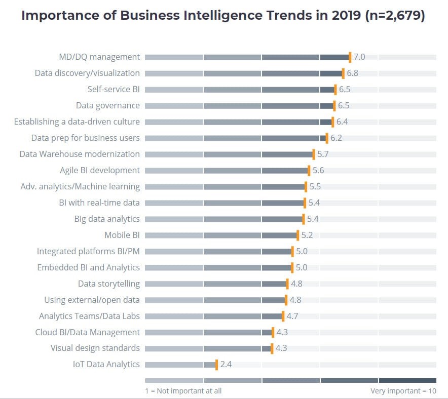 In 2019 zal het management van datakwaliteit een zeer grote rol spelen. Het is niet alleen van belang om veel data uit diverse bronnen te verzamelen. Voldoet de kwaliteit en betrouwbaarheid van die data, alsmede van de context waarin de data worden gebruikt? Op welke wijze worden inzichten uit data gehaald? Dit alles neemt in belang enorm toe met het oog op de te behalen doelstellingen, en krijgt bij organisaties dus hoge prioriteit. Dit blijkt ook uit een onderzoek van bi-survey.com: