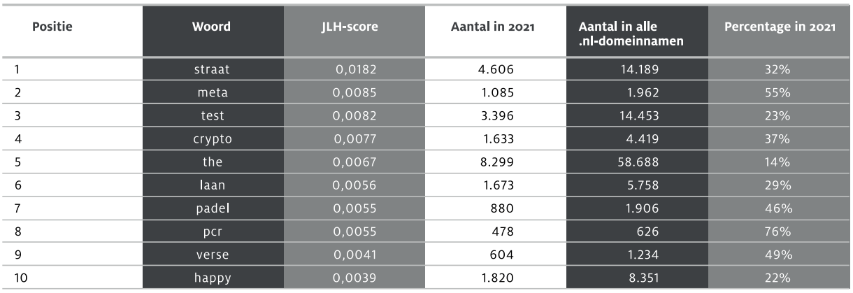 Om een goede analyse te kunnen doen, zijn de woorden in nieuw geregistreerde domeinnamen in 2021 vergeleken met hoe vaak dezelfde woorden gebruikt werden in al bestaande domeinnamen. Woorden die altijd al populair waren, konden op die manier uit de lijst worden gefilterd zodat alleen de woorden overbleven die in 2021 het sterkst op kwamen zetten. Dit levert de volgende top 10 op: