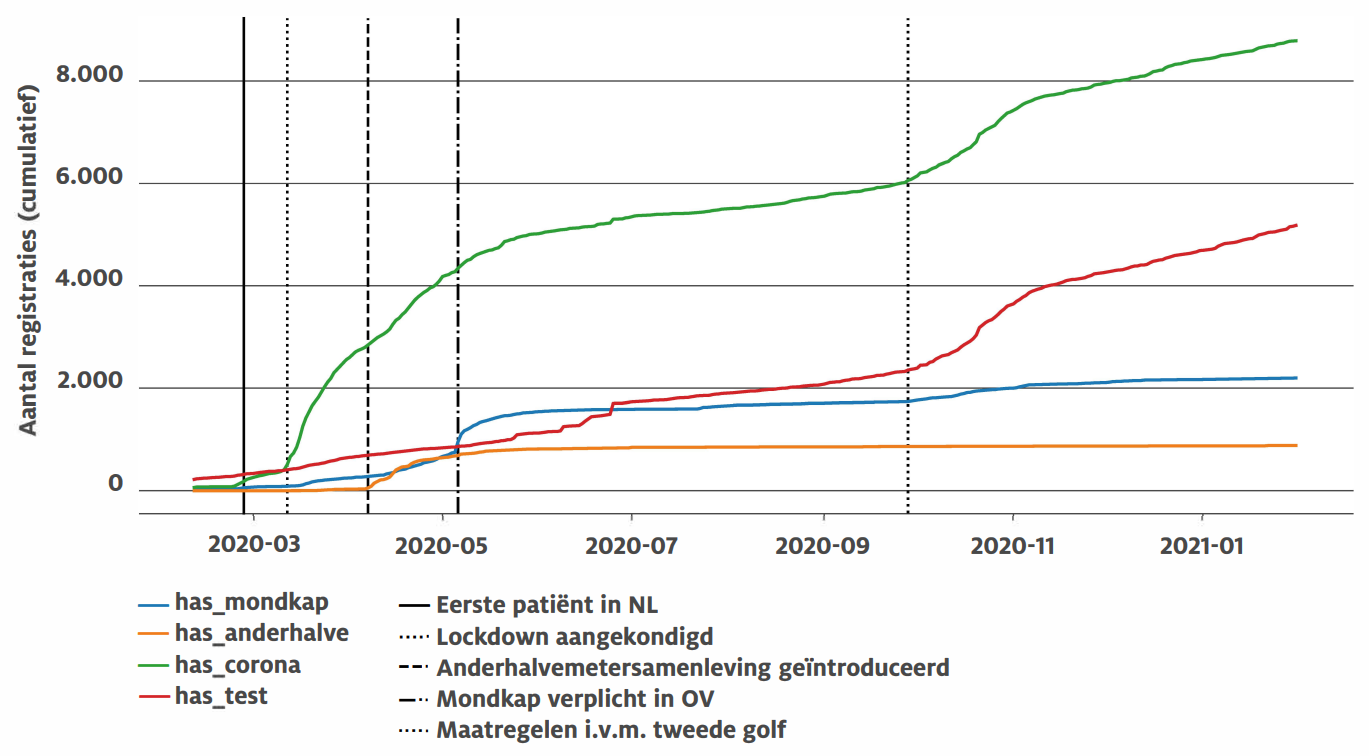 Over corona gesproken, een nadere analyse van de snelheid waarmee domeinnamen werden geregistreerd die verband hielden met de pandemie laat zien dat je er snel bij moet zijn. De volgende figuur toont de toename van het aantal registraties na de verschillende coronapersconferenties: