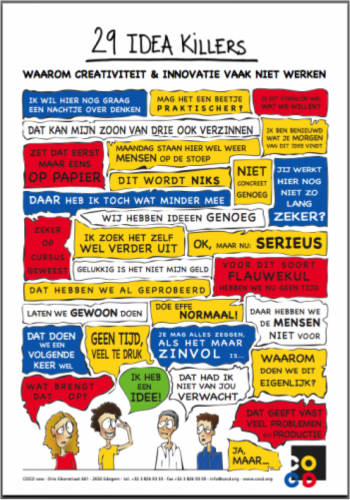 In onze ratiomaatschappij moeten wij angsten op een rationele manier kunnen delen, vanuit ons hoofd dus. Je moet namelijk, heel apart eigenlijk, je gevoel kunnen beargumentereren, om daarmee ideeën voor echte innovatie te kunnen pareren. Deze idea killer poster van het COCD laat de woorden zien die wij kiezen om niet bij onze angsten te hoeven komen (met dank aan Paul Heere van LimeTree).