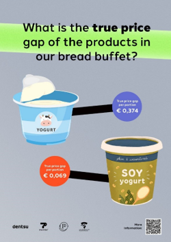 Voor wie nog niet bekend is met true pricing: de true price maakt verborgen sociale en milieukosten zichtbaar, zoals CO₂-uitstoot, watergebruik en arbeidsomstandigheden. Het True price lab van de Hogeschool van Amsterdam onderzocht samen met marketingcommunicatiebureau dentsu, innovatieve cateraar Join Program en de organisatie True Price hoe communicatie over true pricing van voedsel mensen aanzet om vrijwillig de true price te betalen en duurzamer te kiezen.