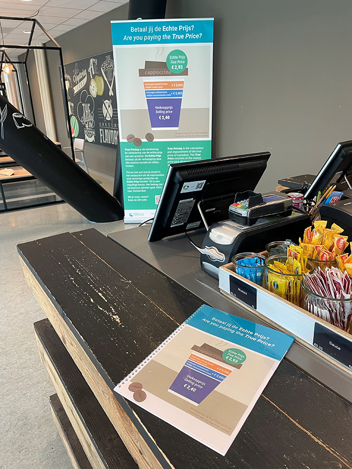 Het onderzoek tijdens de pilot richtte zich op de communicatie over de prijzen: de reguliere verkoopprijs en de echte prijs (true price). Deze communicatie bestond uit banners bij de ingang en de kassa, boekjes bij de kassa, en in het restaurant ook uit bordjes bij de sandwiches en snacks (zie afbeelding 1). Omdat een deel van de studenten en medewerkers op de Business Campus de Nederlandse taal niet machtig is, is de informatie in zowel het Nederlands als Engels gepresenteerd. In alle communicatie werd duidelijk vermeld dat de opbrengsten van de remediering volledig naar Solidaridad ging, en dat de berekening van de true prices waren uitgevoerd door True Price. Daarnaast was er een QR-code beschikbaar voor meer informatie over de true price berekeningen.