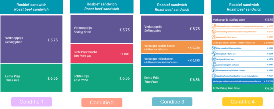 Uit wetenschappelijk onderzoek blijkt dat transparantie bijdraagt aan het consumentenvertrouwen in true pricing en dat vertrouwen de belangrijkste voorwaarde is voor het betalen van de true price (Michalke et al., 2023). Om te onderzoeken welke mate van transparantie in de communicatie over de prijzen het meest bijdraagt aan (a) het vrijwillig betalen van de true price, en (b) de keuze voor voedsel met een lagere true price gap (en dus een lagere sociale en ecologische impact) zijn er voor het onderzoek op de Business Campus vier interventiecondities ontworpen (zie afbeelding 2). De vier interventiecondities werden volgens een vooraf opgesteld schema wekelijks gewisseld, rekening houdend met onderwijsluwe en –vrije weken zodat elke conditie ongeveer evenveel exposure zou krijgen gedurende de twaalf weken van de pilot.