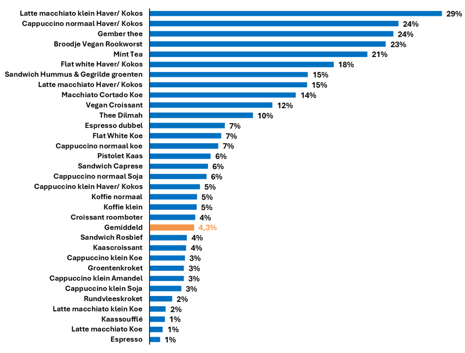 Tijdens de pilotperiode zijn er in totaal 701 transacties geweest met producten waarvan de true price berekend was. Gemiddeld betaalde 4,3% van de consumenten vrijwillig de true price voor producten waarvoor dit kon (zie afbeelding 3). Dit percentage ligt lager dan in eerdere pilots met true pricing op andere plekken. Dat is mede veroorzaakt door het onderzoek achter de pilot: om de communicatie interventies goed te kunnen testen, is met het personeel afgesproken dat er geen extra informatie door hen gegeven werd. Eerder onderzoek heeft aangetoond dat juist de toelichting van het personeel bijdraagt aan de bereidheid om vrijwillig de true price te betalen. Andere mogelijke redenen voor het lagere percentage is de a-typische doelgroep (combinatie van studenten en medewerkers) en het feit dat in het restaurant slechts een klein deel van de producten een true price had. Opvallend is dat het percentage vrijwillige betaling het hoogste was voor latte macchiato en cappuccino met haver/kokosmelk (respectievelijk 29% en 24%) en het laagst voor latte macchiato met koemelk en espresso (1%). Het gemiddelde zegt dus niet zoveel, er is een grote variatie in de bereidheid tot het betalen van de true price tussen de productgroepen.