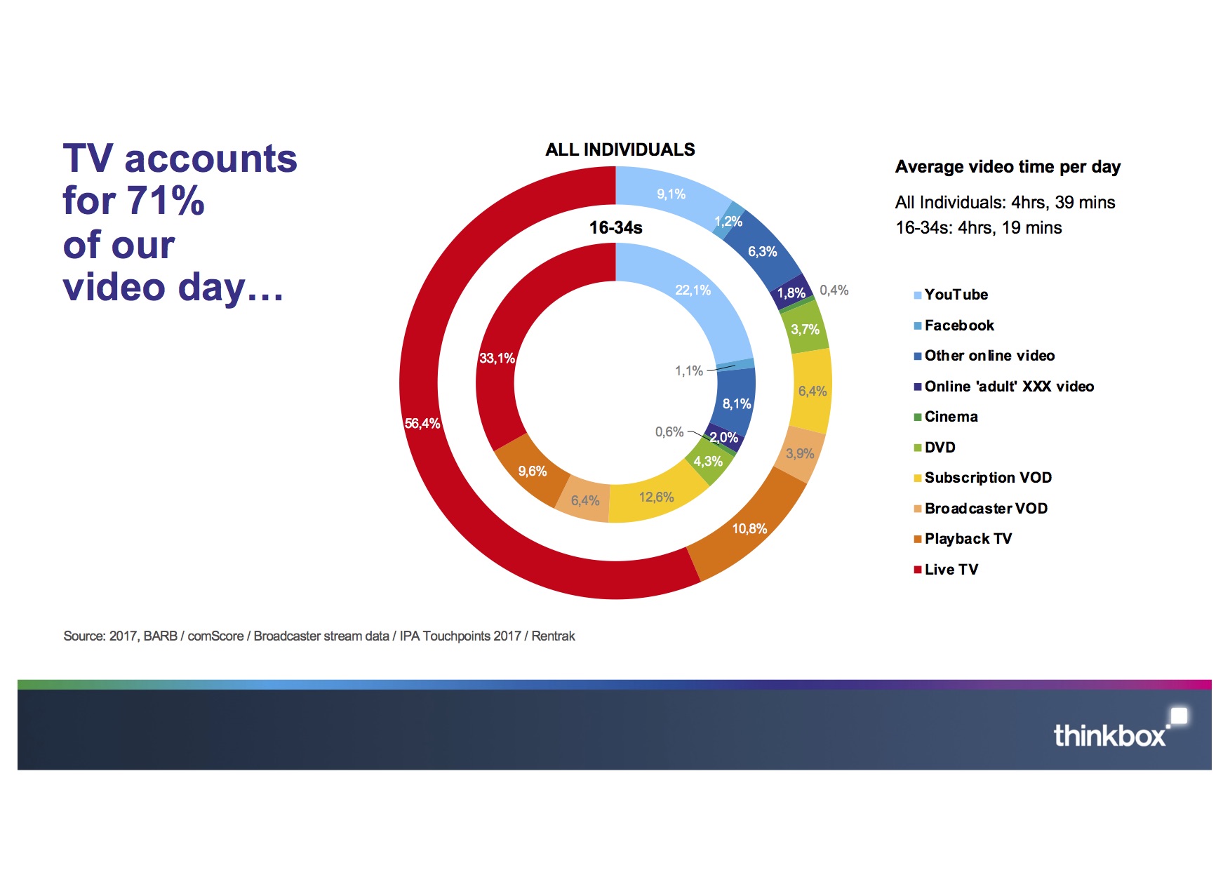 Dit is één van de Thinkbox Killer Charts (op de Thinkbox-website kun je de hele set ‘Killer Charts’ downloaden), die zegt dat tv nog lang niet dood is. Ik ben het ermee eens. Het grootste deel van onze kijktijd gaat naar de tv in de huiskamer. Zelfs als je een hardcore millennial bent, is dat nog altijd het geval.