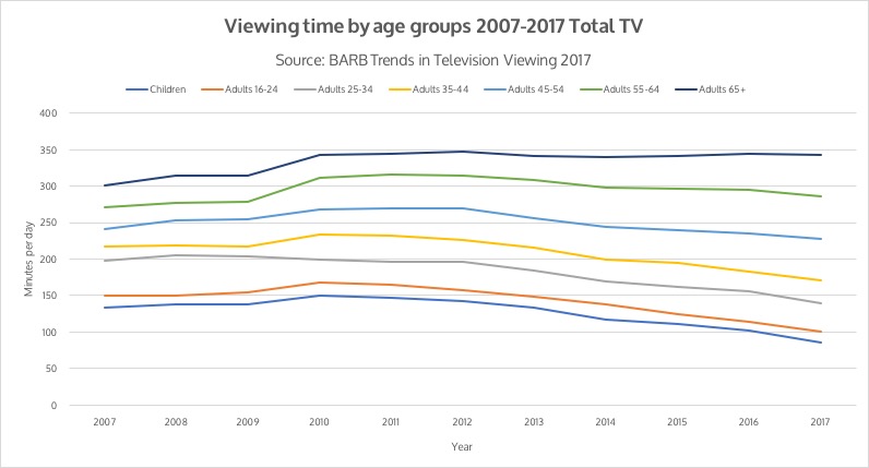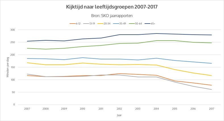 Hier zie je wat SKO (Stichting KijkOnderzoek) en BARB (het Britse SKO) meten als ’tv totaal’, de kijktijd voor de beeldbuis voor verschillende leeftijdsgroepen in de periode 2007 tot en met 2017: