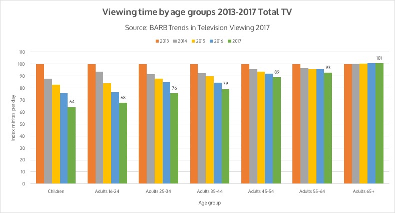 De kijktijd daalt snel. Degenen onder de 35 jaar hebben 25 tot 40 procent van hun kijktijd ingeleverd in de afgelopen vijf jaar. In 2013, in Nederland, keek iemand in de leeftijdsgroep 35-49 179 minuten tv, 1,6 keer zoveel als een 13-19jarige. In 2017 keken zij nog steeds een respectabele 165 minuten. Verschil is dat dat inmiddels 2,75 keer zoveel is als de kijktijd van iemand van 13-19. En die 13-19jarigen zitten over twintig jaar echt niet op de bank naast Mark Ritson. Ik kan het weten, want twintig jaar geleden maakte ik exact dezelfde grafieken voor de Nederlandse dagbladen.