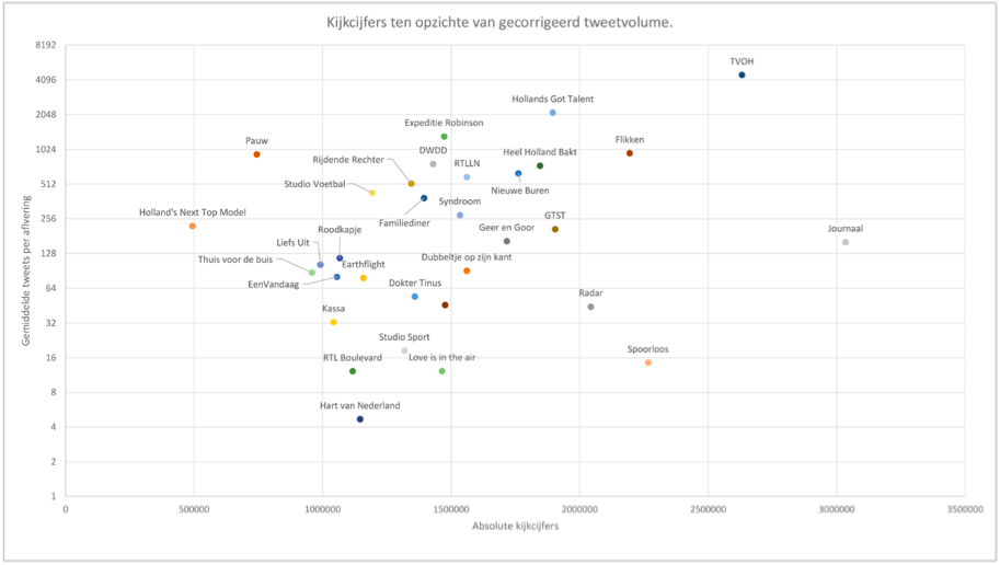 Een overzicht van het gemiddeld aantal berichten per programma (y-as) ten opzichte van de kijkcijfers (x-as):