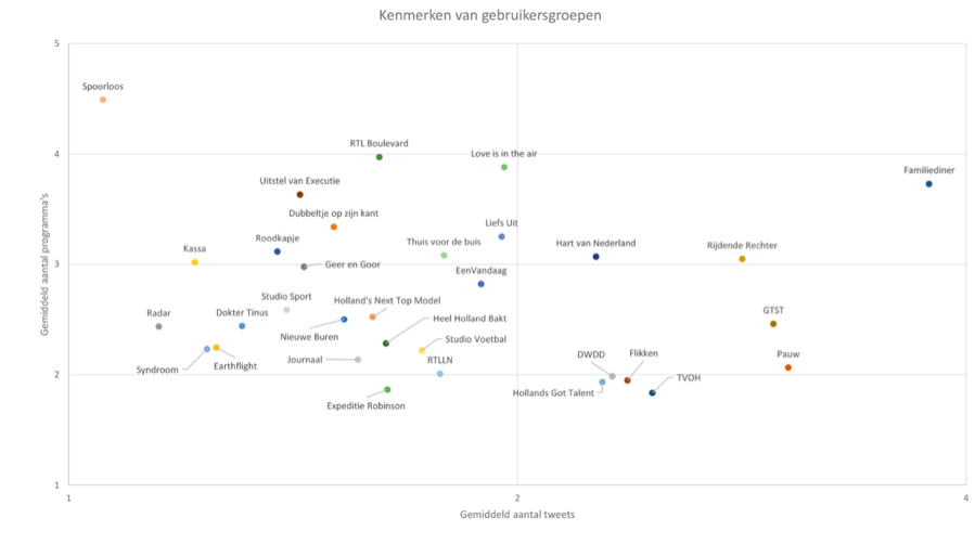 Bovenstaande grafiek toont het gemiddeld aantal tweets over een programma (x-as) tegenover het aantal andere programma’s waar de twitteraar berichten over plaatst (y-as)