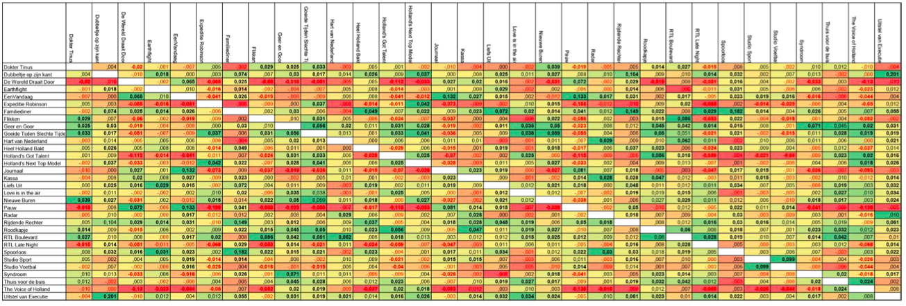Doordat een twitteraar over meerdere programma’s berichten plaatst, kun je kijkgedrag en groepen kijkers identificeren. Uit andere tweets kan afgeleid worden waar iemand nog meer naar kijkt. Dit blijkt uit onderstaande matrix. Een groen vakje impliceert een correlatie tussen de programma’s, is dit juist niet zo dan is het vakje rood.